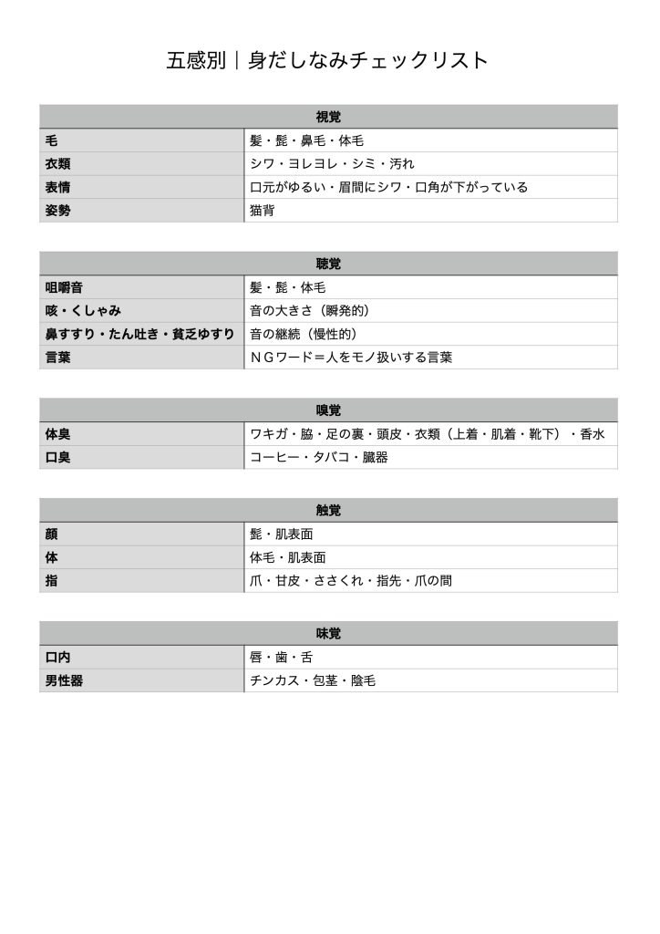 購入特典で『五感別|身だしなみチェックリスト』を用意しました。徹底的な身だしなみができているかリストを見ながらチェックしてみて下さい。